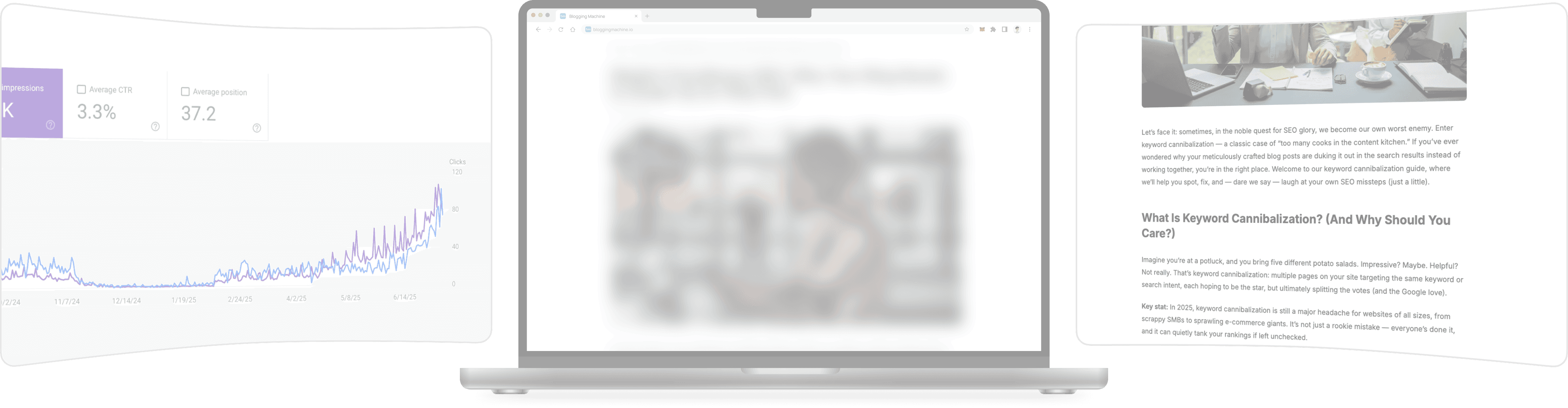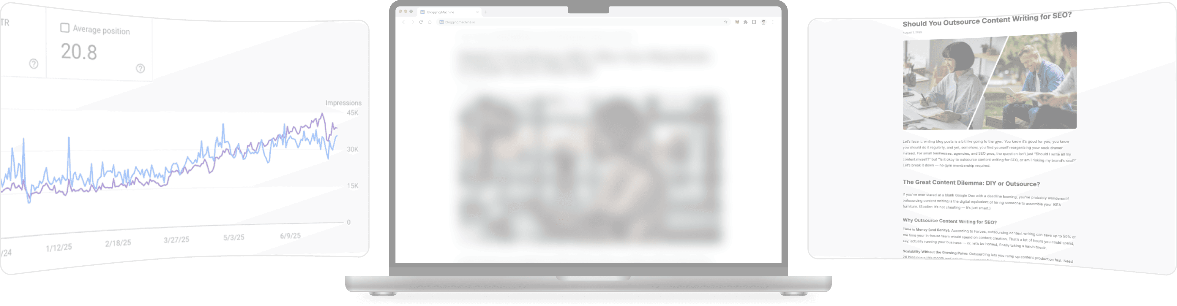 Bloggingmachine.io transformed our traffic growth from flatline to steady visitor flow. Within a week of posting, clicks and impressions went up and stayed there. AND this is high-intent traffic we’ve never seen with traditional SEO.
